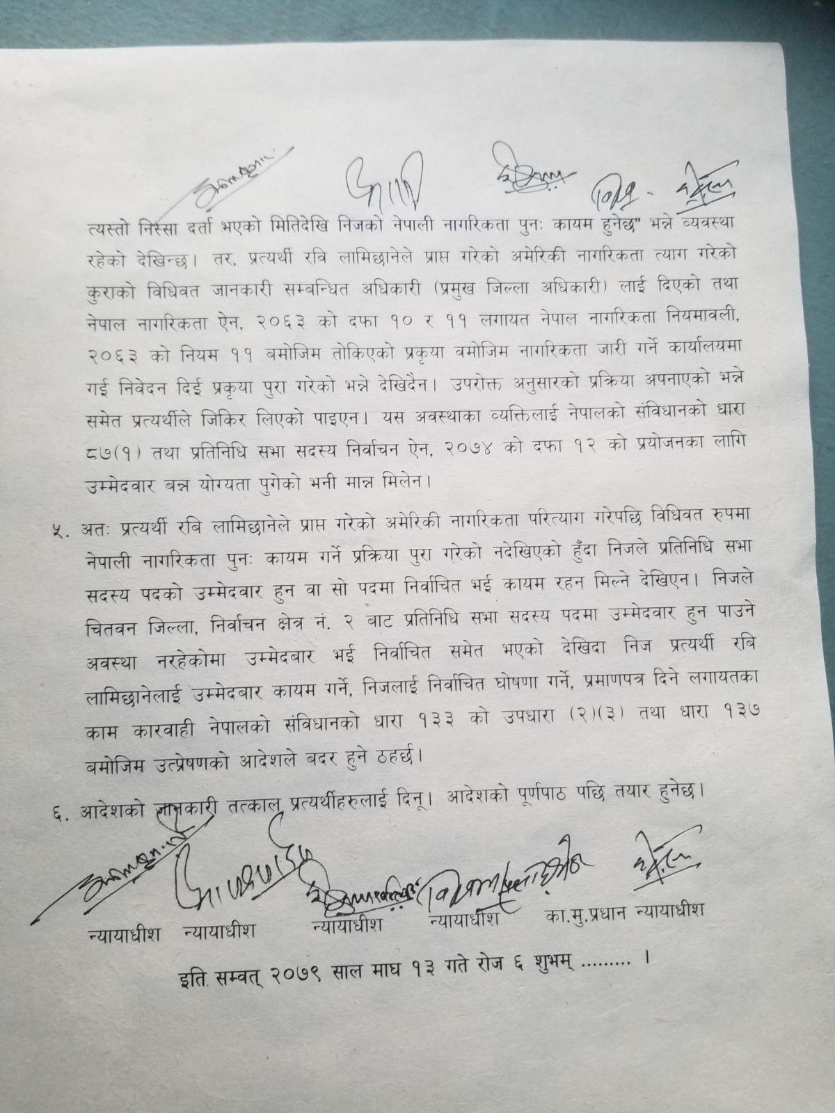 कामु प्रधानन्यायाधीश हरिकृष्ण कार्की नेतृत्वमा न्यायाधीशहरू विश्वम्भरप्रसाद श्रेष्ठ, ईश्वर खतिवडा, आनन्दमोहन भट्टराई र अनिल सिन्हा संलग्न संवैधानिक इजलासको यो फैसलासँगै लामिछानेको मन्त्री तथा सांसद पद खारेज भएको छ । त्यस्तै उनी राष्ट्रिय स्वतन्त्र पार्टीको सभापति बन्न समेत अयोग्य भएका छन् ।